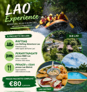 Nasce la promo esclusiva “Lao Experience”, una collaborazione tra Rafting Adventure Lao, B&B Lao e Lao Bistrot: un pacchetto completo dedicato a chi vuole vivere un weekend o una giornata tra natura, sport, relax e buona cucina nella Valle del Fiume Lao, in provincia di Cosenza.